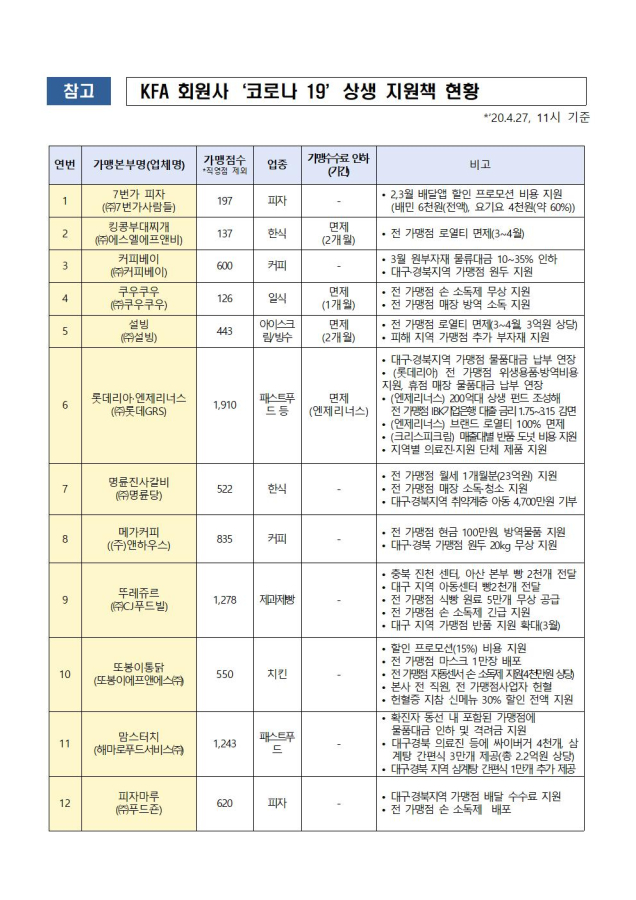 □ 한국프랜차이즈산업협회 회원사 상생 지원책 현황(4.27)