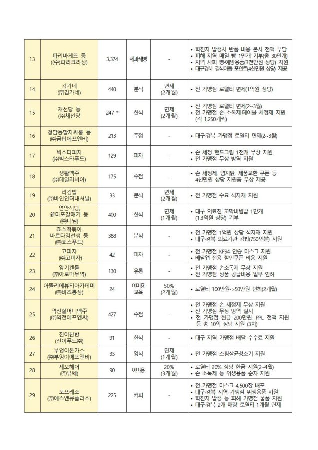 □ 한국프랜차이즈산업협회 회원사 상생 지원책 현황(4.10)